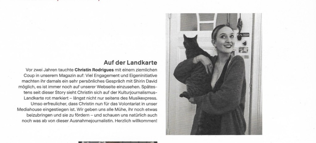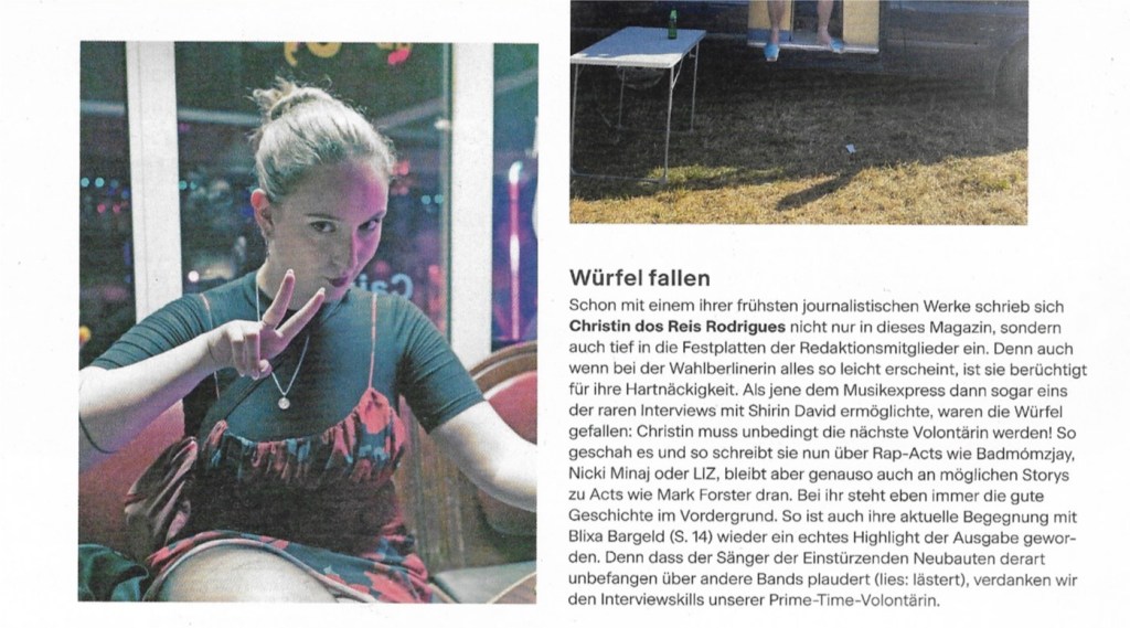 Willkommen auf meinem Portfolio! Seit 2021 arbeite ich als freie Autorin u.a. für den Musikexpress, Rolling Stone und HipHop.de. Anfang 2023 habe ich dann ein Volontariat angefangen, das mir ermöglichte weitere Erfahrungen in Print, Online, Video, Audio und Social Media zu sammeln – von News über Interview bis hin zu Features und Rezensionen.